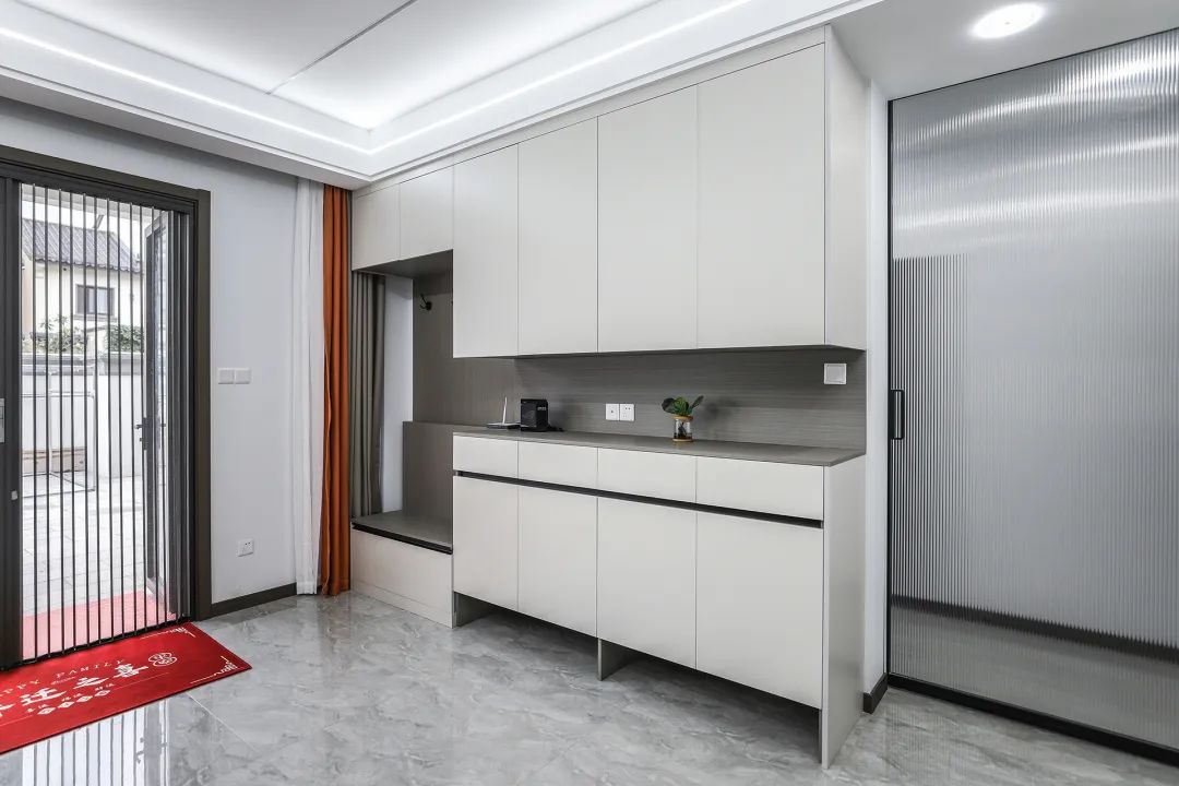 進門玄關采用中間鏤空通頂柜設計,體現生活“一半煙火,一半清歡”的理念??白色柜子是鞋柜,整面鞋柜滿足一家人鞋子的收納。黑色柜子是儲物柜,放一些比較雜的物品(快遞盒、各種囤貨、雨傘等),鞋柜和儲物柜都做了扣手槽設計讓生活更輕松。