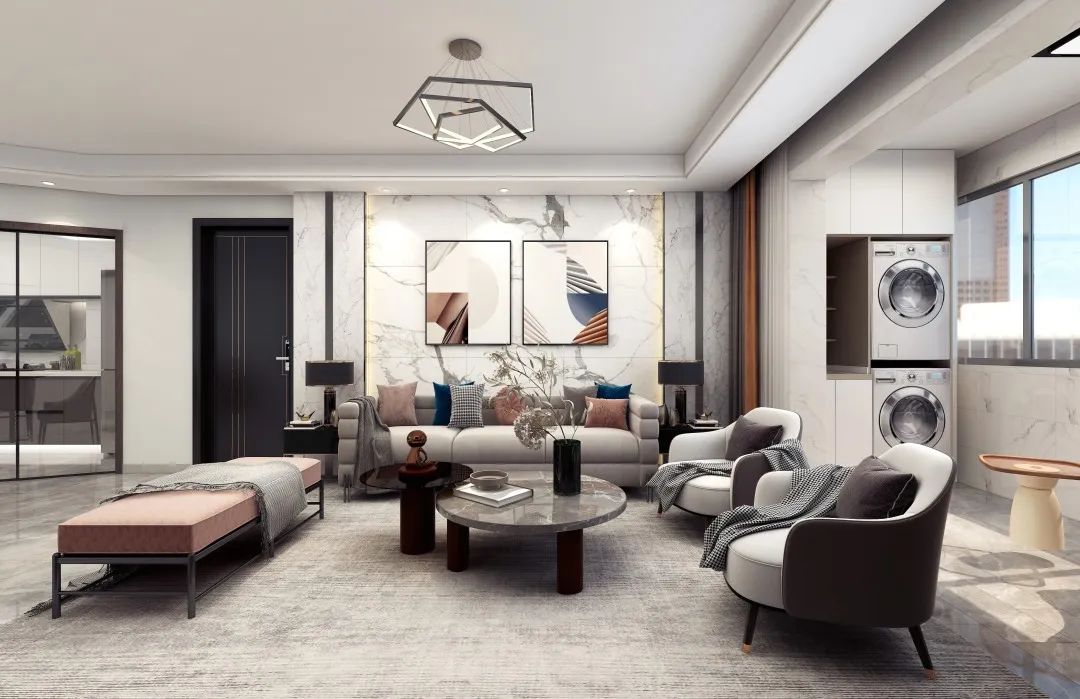 設計說明:本設計營造出清新、明快、自然的氛圍。客廳中擺放著舒適的沙發和地中海風格的裝飾品,讓人感到寧靜和放松。同時,大理石墻面和白色的定制柜相互呼應,營造出清新明亮的氛圍。