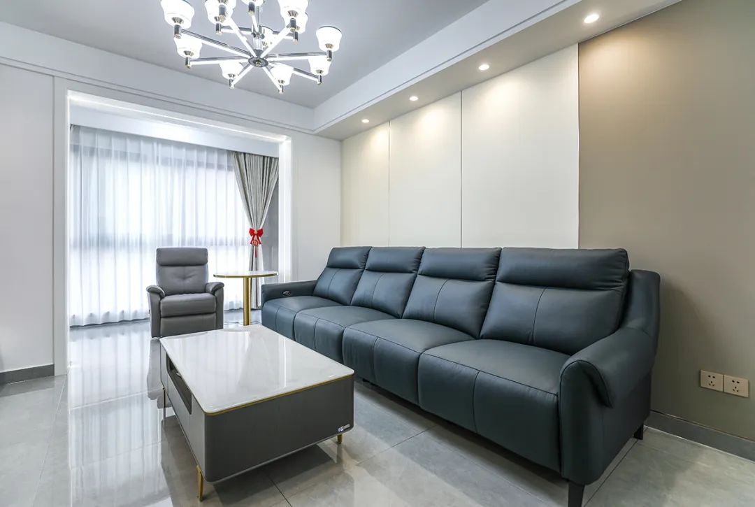 這個(gè)客廳擁有寬敞的空間,電視墻整體使用石紋竹木纖維板,灰白色調(diào)的石紋和極窄線條,明暗有神,給人一種高貴而神秘的感覺。藏青色皮質(zhì)沙發(fā)擺放在其中,瞬間提升了整個(gè)客廳的檔次,而一組按摩沙發(fā)的加入,更為客廳增添了一份舒適與愜意。