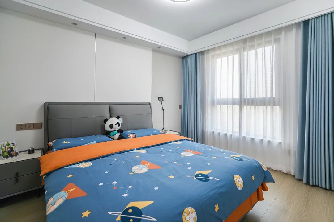 兒童房1.8米灰色皮包床保證小朋友睡覺時(shí)有充足翻身空間,睡的安全。衣柜區(qū)域正對(duì)進(jìn)門區(qū)做一排玻璃門,里面可以放小朋友的玩具和書本。床頭背景墻米白色結(jié)合淺灰色竹木纖維墻板,既讓奶白色柜門和墻面、頂面渾然一體,同時(shí)呼應(yīng)了灰色床、床頭柜。
