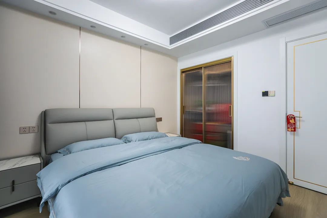 客房不僅考慮到了實(shí)用性和舒適性,還充分融入了家庭成員的生活習(xí)慣和感受。增加收納的同時(shí),力求給人一種溫暖與舒適的感覺。而衣柜門板采用條紋玻璃,則讓整個(gè)空間更加寬敞明亮。