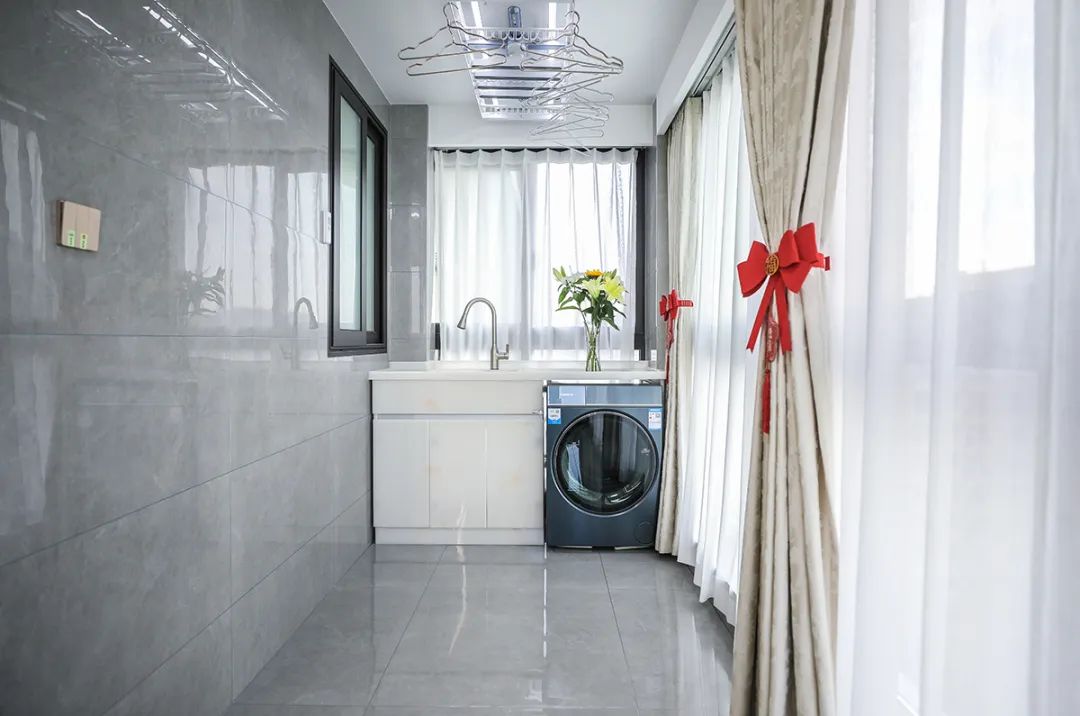 陽臺(tái)是家居生活中不可或缺的一部分,它不僅是晾曬衣物的場所,更是一個(gè)可以享受陽光、感受自然的空間。在這里,一側(cè)擺放著洗衣機(jī)和水池,方便洗衣和清洗,另一側(cè)則是一張按摩椅,可以讓主人在忙碌一天后放松身心。