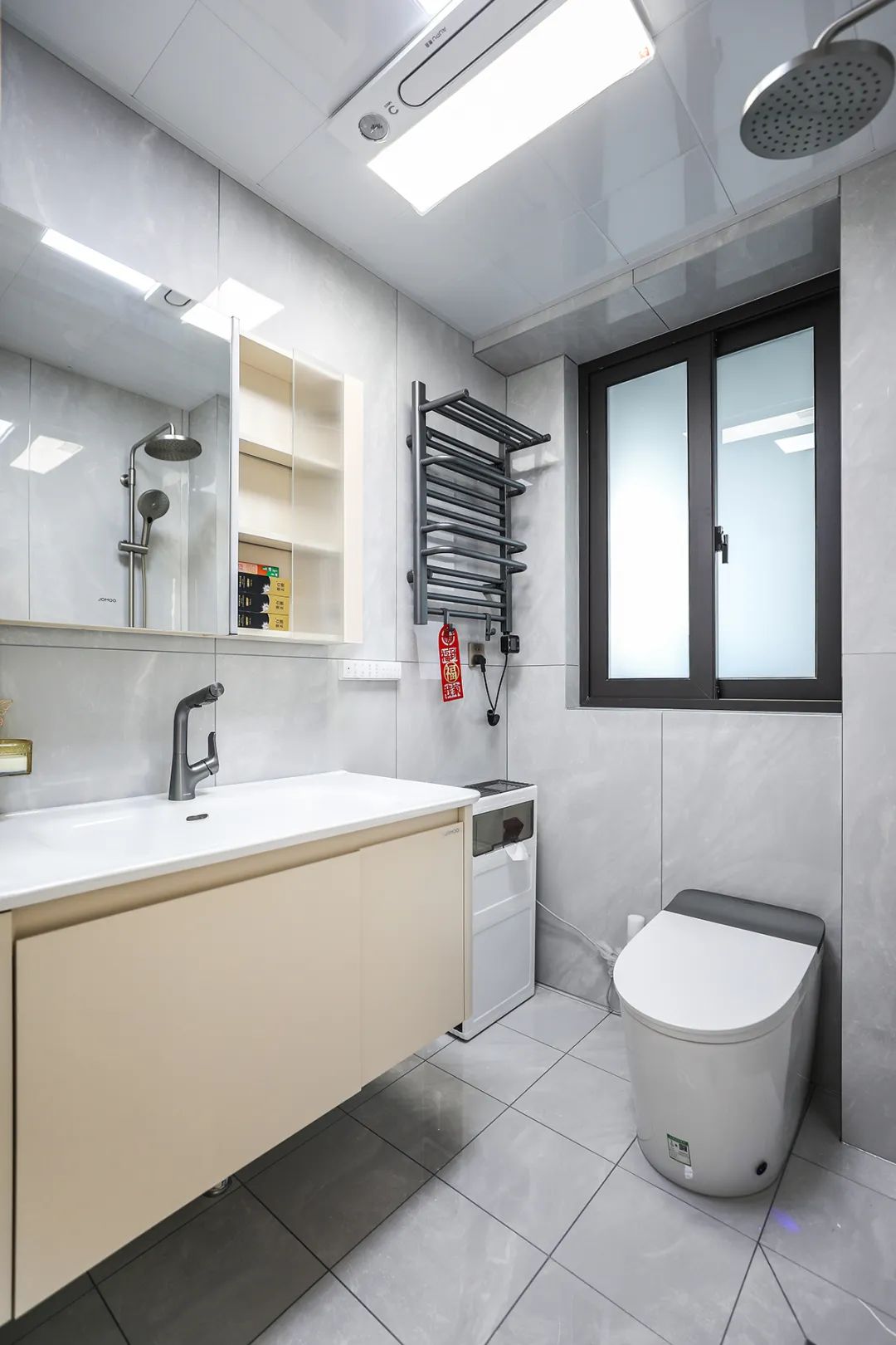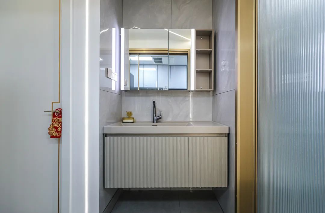 這個(gè)客衛(wèi)通過精心設(shè)計(jì)和布陳充滿了高檔次的美感。1.2米長的洗手臺(tái)、智能馬桶,墻地一體磚以及白色吊頂?shù)拇钆洌瑹o一不體現(xiàn)出主人優(yōu)雅、獨(dú)特的生活品味。