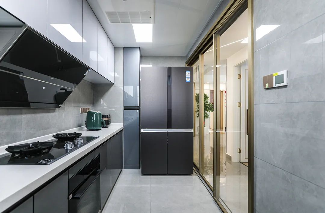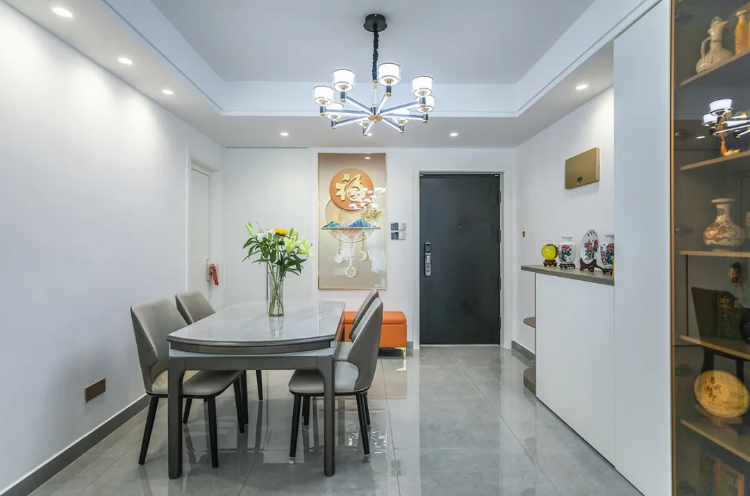 巖板餐桌為用餐區域注入了溫暖的氛圍,淺灰色地磚潔凈明亮,這樣的設計充滿了人情味,讓用餐變得更加享受。同時整個餐廳空間充滿了舒適、溫馨與和諧的氣息,著重體現主人對生活的熱愛與追求。