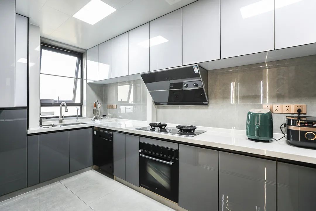 這個廚房空間十分寬敞,采用了流行的L型一面櫥柜設計,使得儲物空間得到了極大的提升。整個廚房的顏色搭配簡潔明快,底部櫥柜材質選擇干凈且易于打理的材質,讓整個廚房看起來更加整潔有序。白色的吊頂與上面淺色的櫥柜相呼應,營造出一種清新宜人的氛圍。