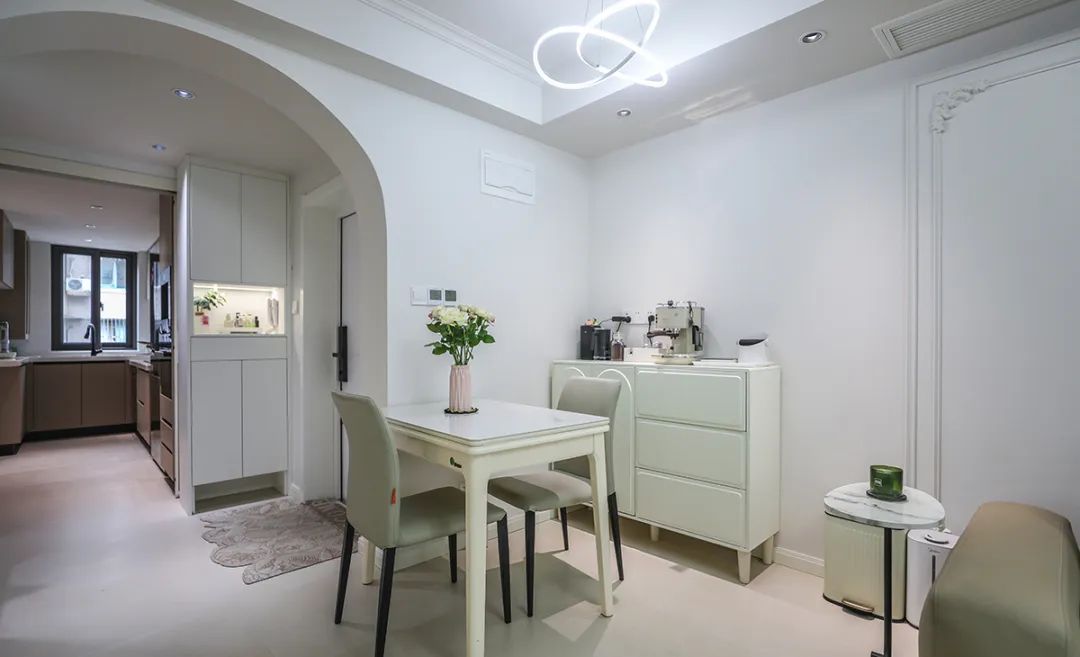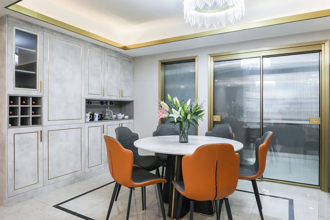現代輕奢餐廳:輕奢風格以精致、高雅、舒適為主,強調材質和燈光的運用。餐廳空間采用封閉式設計,與客廳和廚房形成了分隔。餐桌和椅子選擇巖板材質,搭配灰色墻面和金色裝飾條,營造出高貴而典雅的就餐環境。