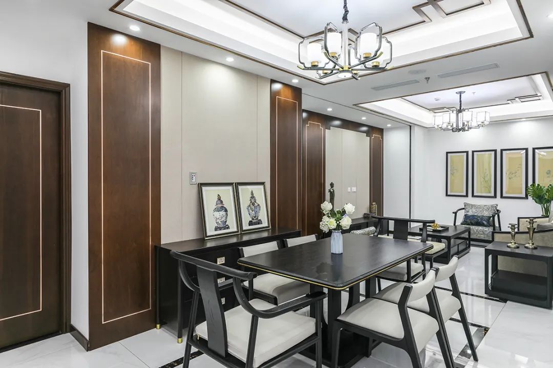 新中式餐廳:本設計采用傳統新中式風格,以傳統元素和現代設計為主,注重材質和細節的處理。因空間有限,餐廳采用開放式設計。餐桌和椅子選擇深色木質材質,搭配實木板材墻面、臺桌、藝術裝飾畫,營造出傳統而典雅的就餐環境。吊燈采用古典的中式風格,與整個空間風格相呼應。