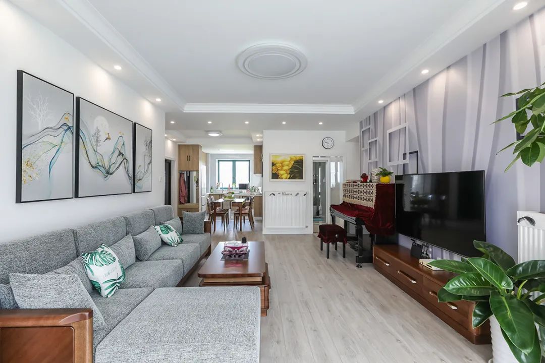 設(shè)計(jì)說明:這個(gè)客廳以白色和灰色為主調(diào),營(yíng)造出簡(jiǎn)約、舒適的感覺。純灰色布藝沙發(fā)顏色與整個(gè)空間的色調(diào)相呼應(yīng)。再搭配上一些綠植和裝飾,讓整個(gè)空間更加現(xiàn)代感十足。電視墻的裝飾和沙發(fā)墻的裝飾畫均采用具有布藝漂浮感的形式,讓空間更具盈動(dòng)感。
