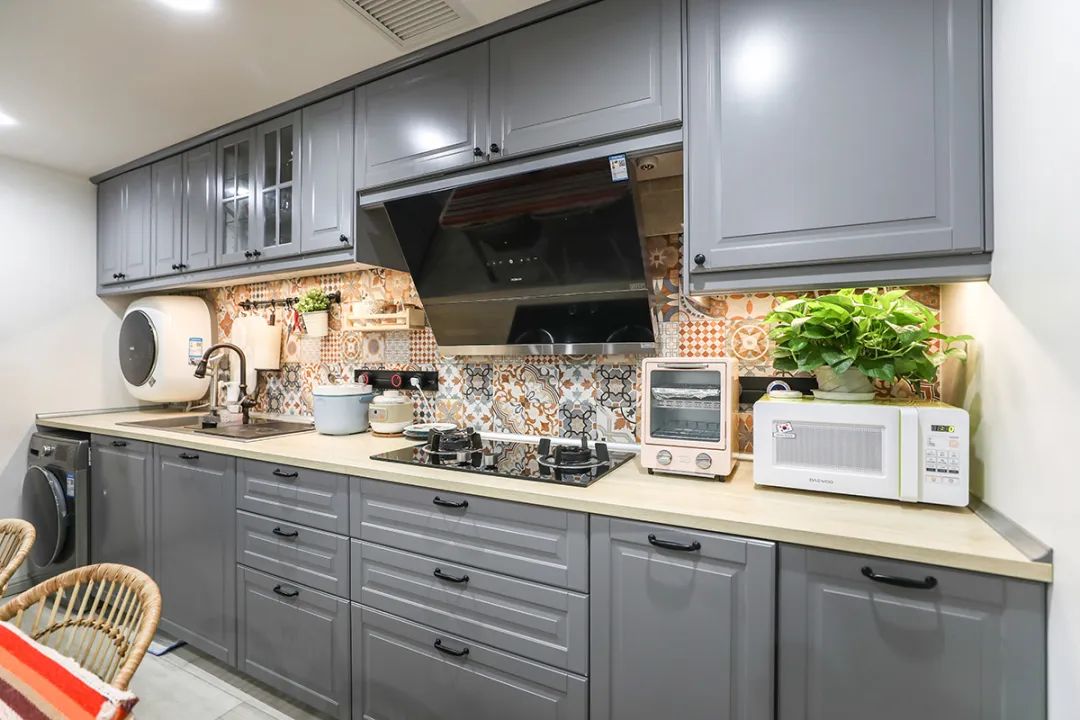 設(shè)計(jì)說明:這個(gè)廚房裝修風(fēng)格采用狹長型的空間布局,一字型廚房是一種常見的廚房布局,通常是將櫥柜呈一字排開,所有操作區(qū)域在一條直線上的廚房布局。這種布局一般適用于小戶型或公寓戶型的房子。
