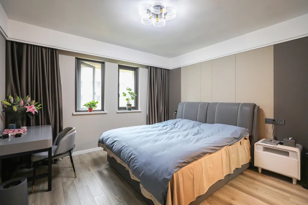 設計說明:本案著重體現簡約風中的“簡”字,打造一個自然舒適的臥室空間。整個空間沒有過多裝飾,搭配淺色調的涂料和原木色的地板,營造出自然溫馨的氛圍。軟裝方面,選擇了通頂家具和舒適的床品,讓空間簡約的同時更顯舒適。