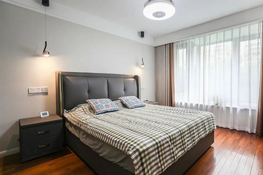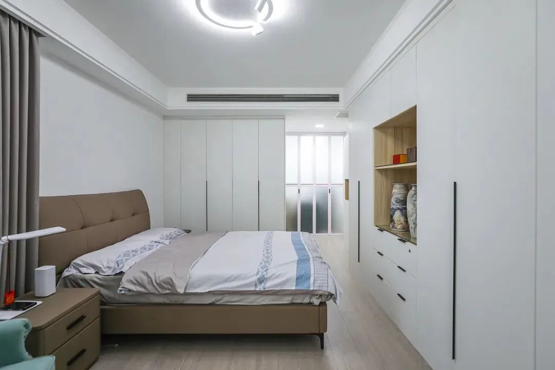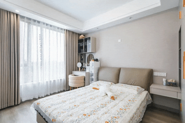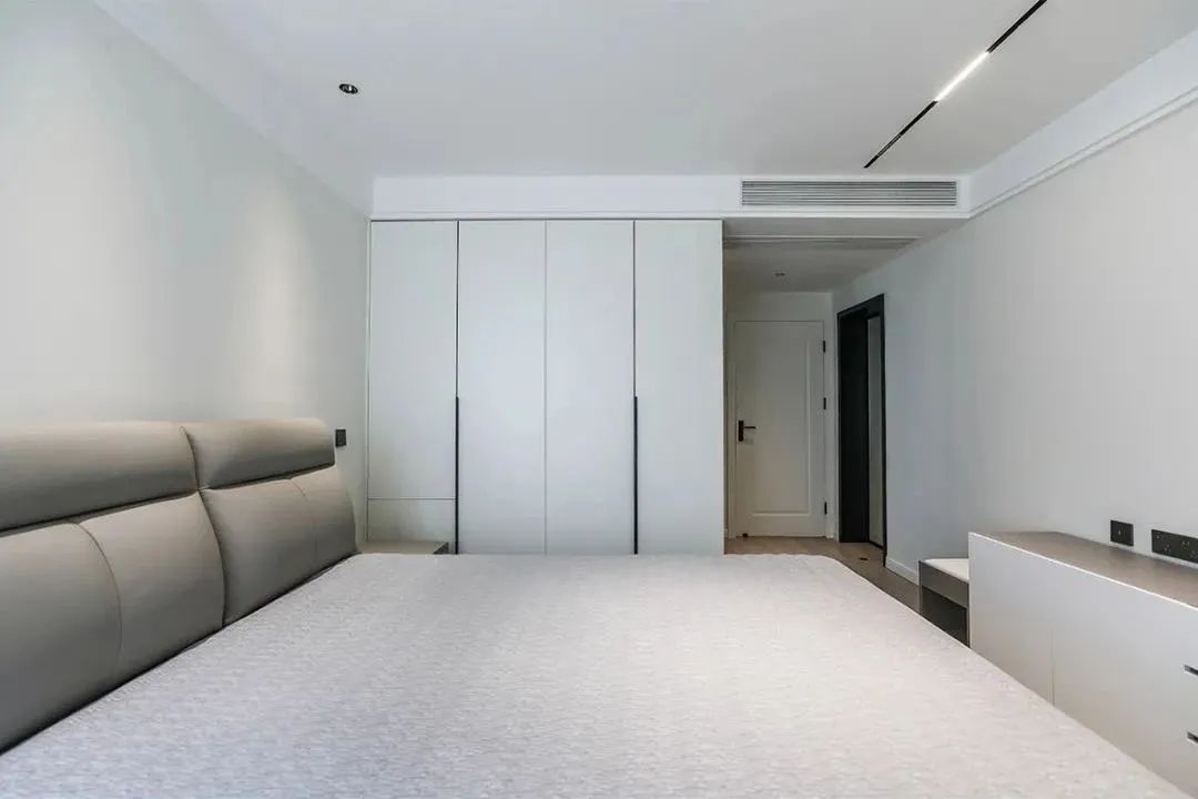 鎮坪路176弄:該套房主臥地面鋪以暖灰色地板,衣柜與墻面色彩統一,相得益彰。四周雙眼皮吊頂加上中間拉平無主燈的設計,讓空間顯得尤為寬敞。根據業主需求我們在有限的空間里做了衛生間,實現“帶衛生間主臥”的夢想。床尾還特地定制了電視柜,這間臥室的各種設計細節基本能滿足業主的所有居住需求。