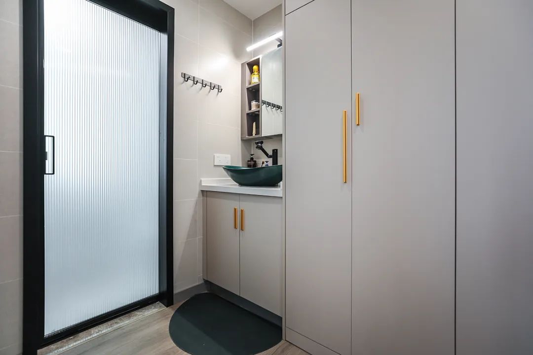↑↑接上,而且由于這個主臥空間比較大,我們根據業主精致的生活方式,將臥室分割出一個帶洗手池的衣帽間,衣帽間采用雙面通頂柜,滿足業主海量衣物收納,洗手池設計也讓業主起床洗漱更加便捷。