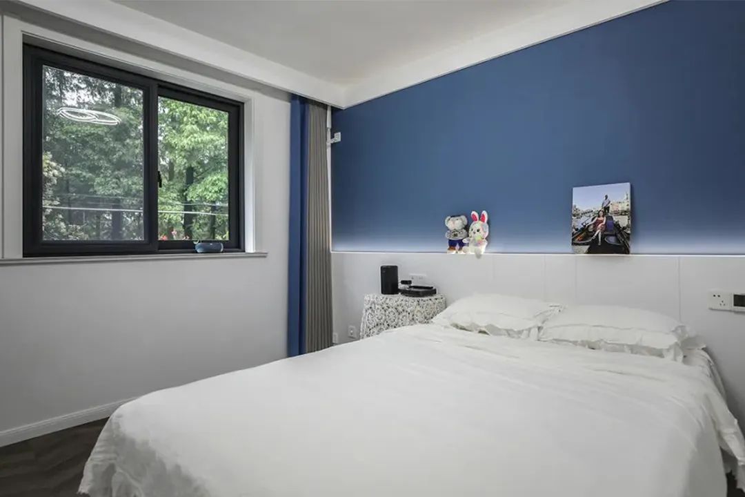 巨峰路997弄:這套房根據業主的喜好采用的是奶油風裝修風格,而且業主對海洋、對海洋藍色情有獨鐘,由于海藍色和奶油白色對比度比較大,一般很少采用將這兩種顏色作為大面積色使用,為了滿足客戶的喜好和要求我們將床頭背景用海藍色、其它三面墻用白色,背景藍色做了簡單的燈光處理,將藍色漸變化,消解一些藍色,讓藍色融入整個奶油風格中。窗簾也采用了海藍色窗簾,這樣可以通過光的折射讓奶油白墻上也多了一些藍色的靈動,兩種顏色很好的溶解在一起,更顯和諧。