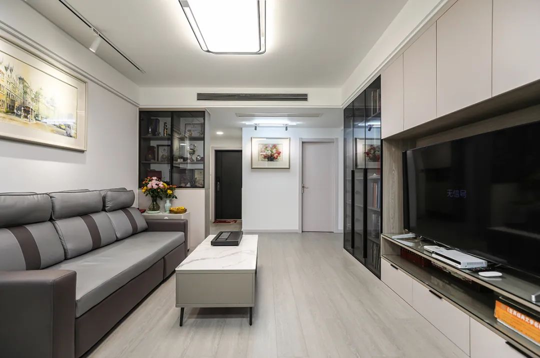 該房業主是一對夫妻,都是退休教授,基于業主的需求,該套居室用暖灰木紋色搭配暖白色的基色,讓整個房子呈現出客戶想要的高貴大方,溫暖宜居的感覺。電視墻以大面積玻璃櫥柜,在提供客戶儲藏展示書籍、展品的同時,增加空間通透感。放置藍灰色皮質沙發,再用白色巖板茶幾搭配,簡潔、神秘和有質感。通過精心布置打造出退休教授夫妻的頤養三居,塑造出簡中有序恰好處的氛圍感