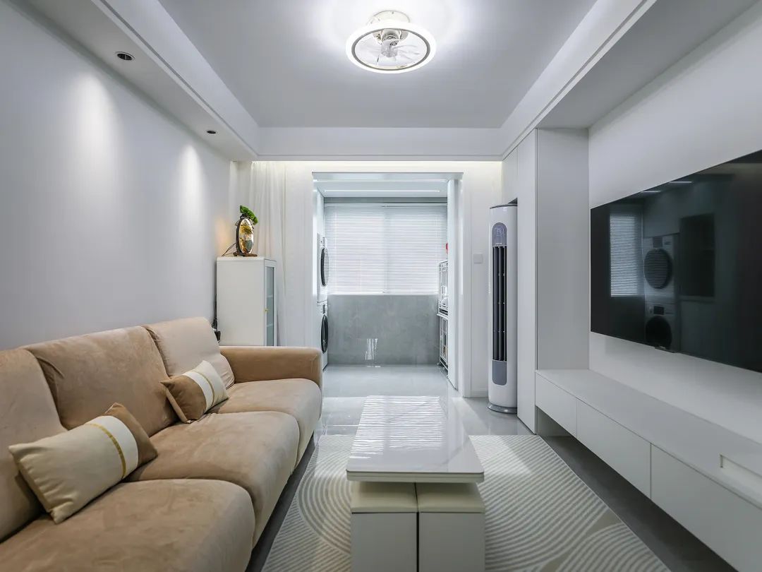 客廳以簡潔實(shí)用為主,地面瓷磚通鋪至陽臺,各區(qū)域融合度高。由于空間關(guān)系,我們拆除原有移門,來提升空間感。頂面沒有做復(fù)雜吊頂,采用走邊,墻面簡用乳白色涂料,整個客廳空間層次分明、寬敞而明亮。