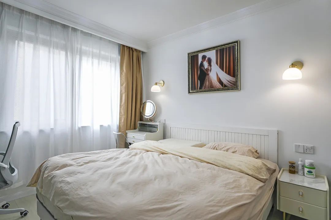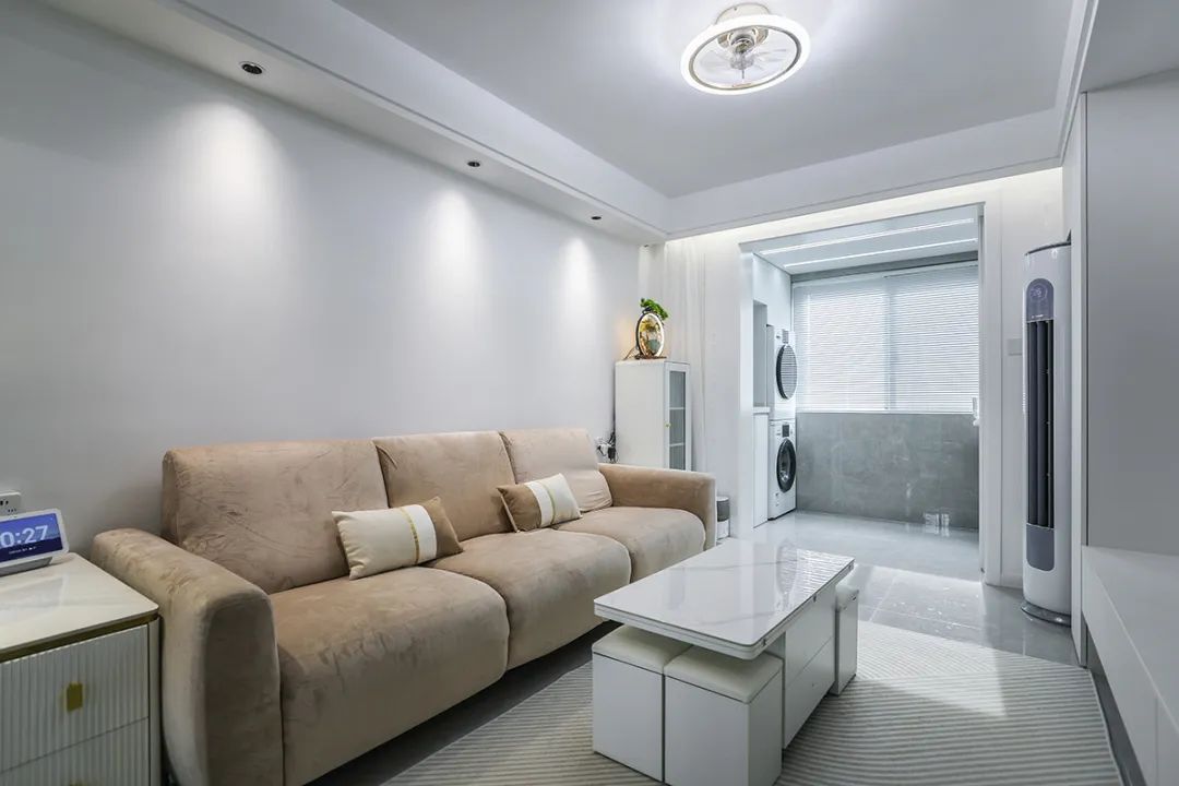 該居室是我們?yōu)樾煽诰拇蛟斓幕榉浚b修風(fēng)格為現(xiàn)代輕奢風(fēng)格,整體線條簡潔、造型簡單、色彩淡雅。考慮到平時只有夫妻兩人居住,我們以二室一廳為基礎(chǔ)布局,大房間主要做居住空間,而小房間則巧妙地改造成了健身房。這樣設(shè)計既考慮到了實(shí)用性,又滿足了業(yè)主的個性化需求。