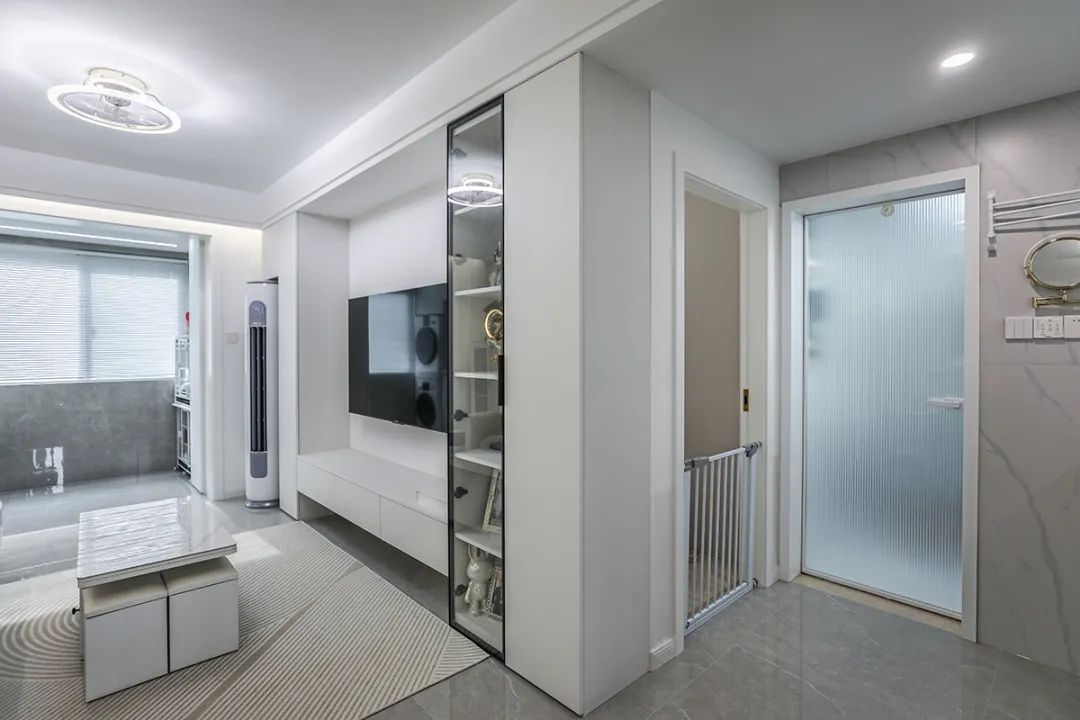 由于預(yù)算有限,我們沒有做復(fù)雜的背景墻,僅定制一排電視柜。右邊玻璃展示柜,空調(diào)藏柜子中,一體化效果和裝飾效果極佳。