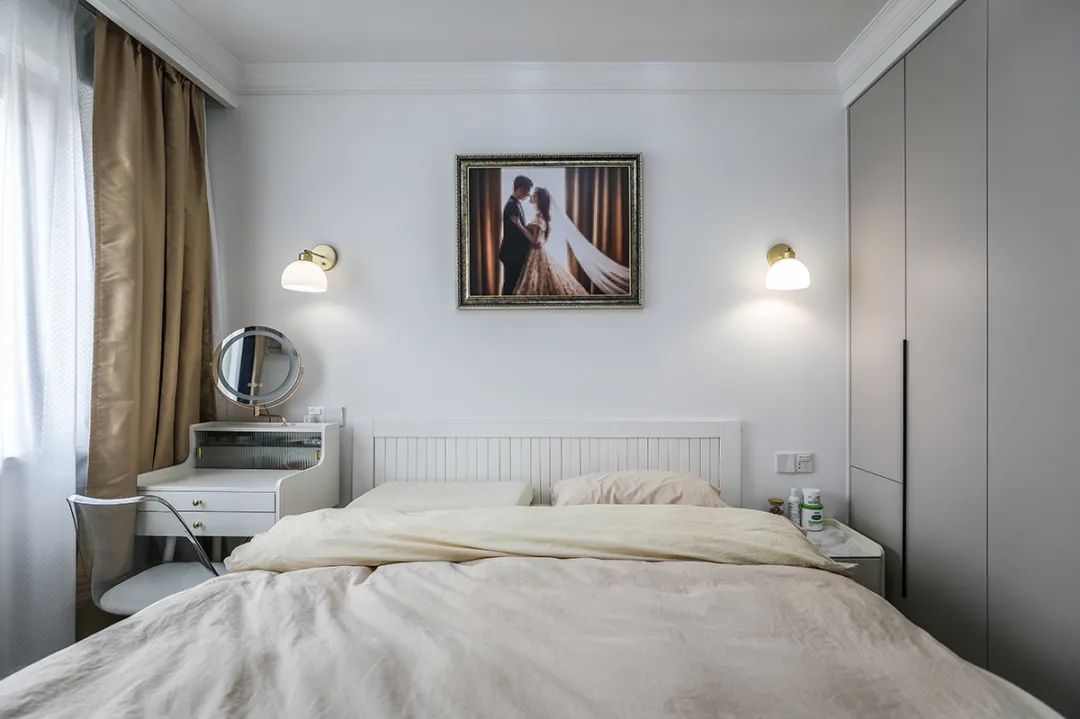 主臥相對簡單實(shí)用,頂面石膏線走邊,墻面淺色涂料。1.8床左邊床頭柜右邊梳妝臺,衣柜靠近床頭柜單獨(dú)設(shè)計門板。墻中用裝飾畫點(diǎn)綴,整體空間更顯自然協(xié)調(diào)。