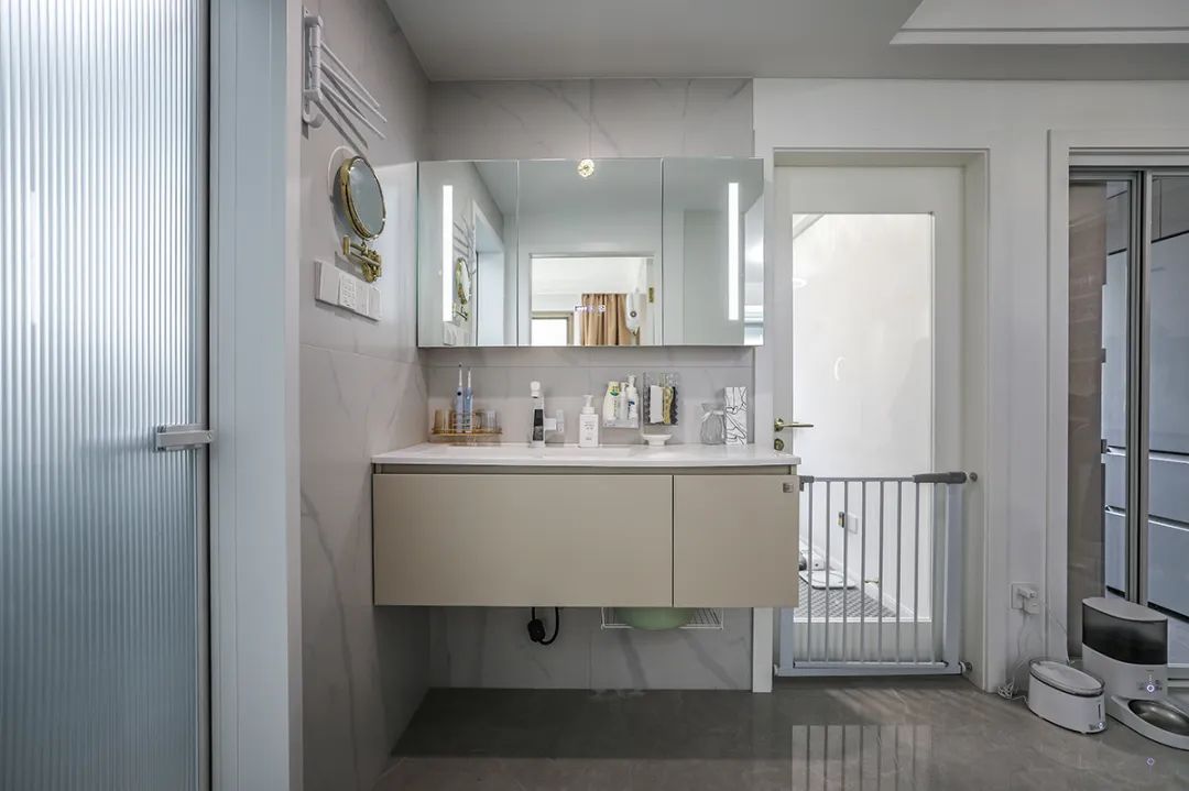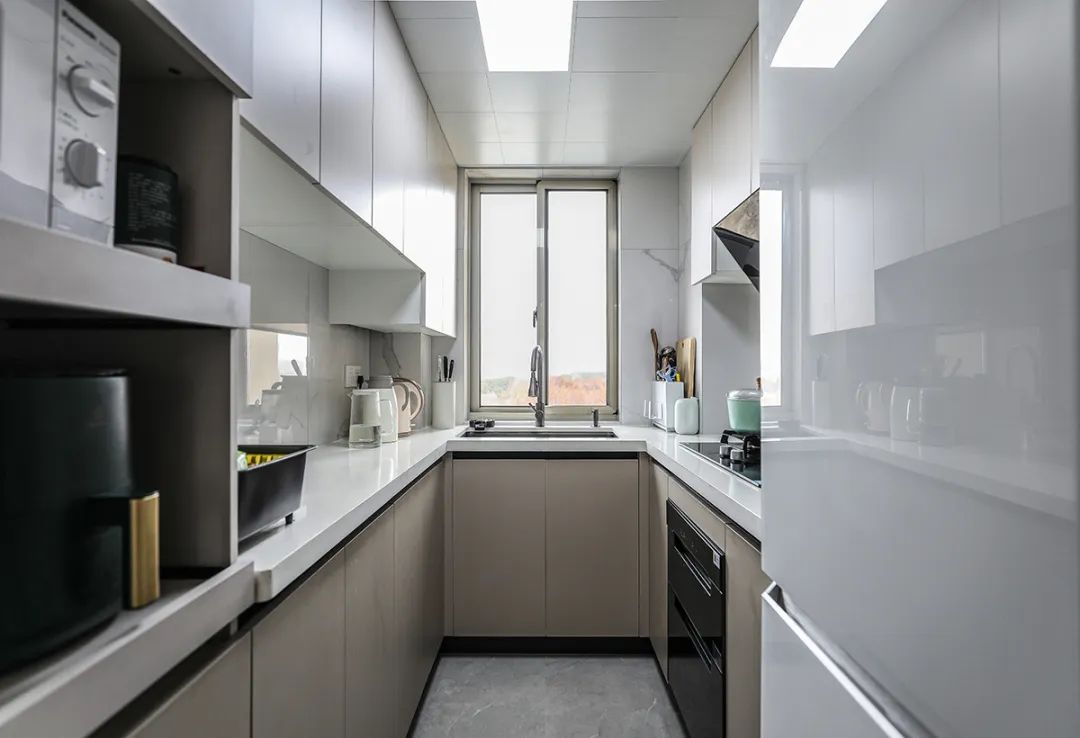 根據(jù)空間實(shí)際情況,我們把廚房設(shè)計為U型。首先我們將原櫥門拆除,做三聯(lián)玻璃移門,讓進(jìn)出更加方便。再者我們定制U型櫥柜,增加臺面空間。臺面選用石英石材質(zhì)更易打理。定制柜可分類擺放或存儲,不僅可滿足主人存儲食材需求,還能將各種家電嵌入其中,讓廚房空間不凌亂。