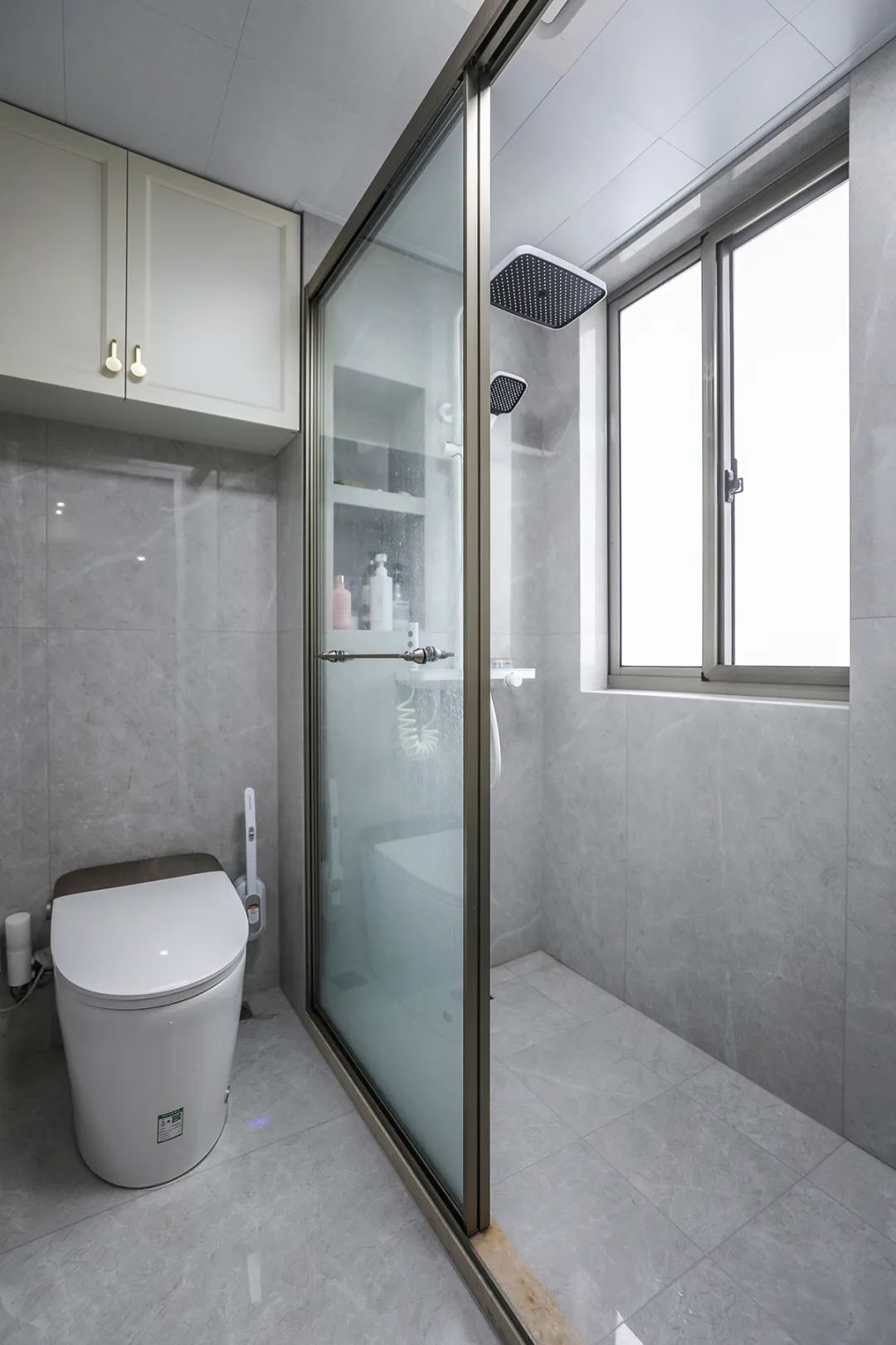 衛(wèi)生間做干濕分離。干區(qū)墻地面通鋪一體大磚。金色窄框淋浴房用同色小磚做下水坡度。為提升空間儲物能力,我們在淋浴區(qū)利于原有管道做雙層壁龕、馬桶上方也增加一排懸空柜,讓衛(wèi)生間化身為“小儲物間”。