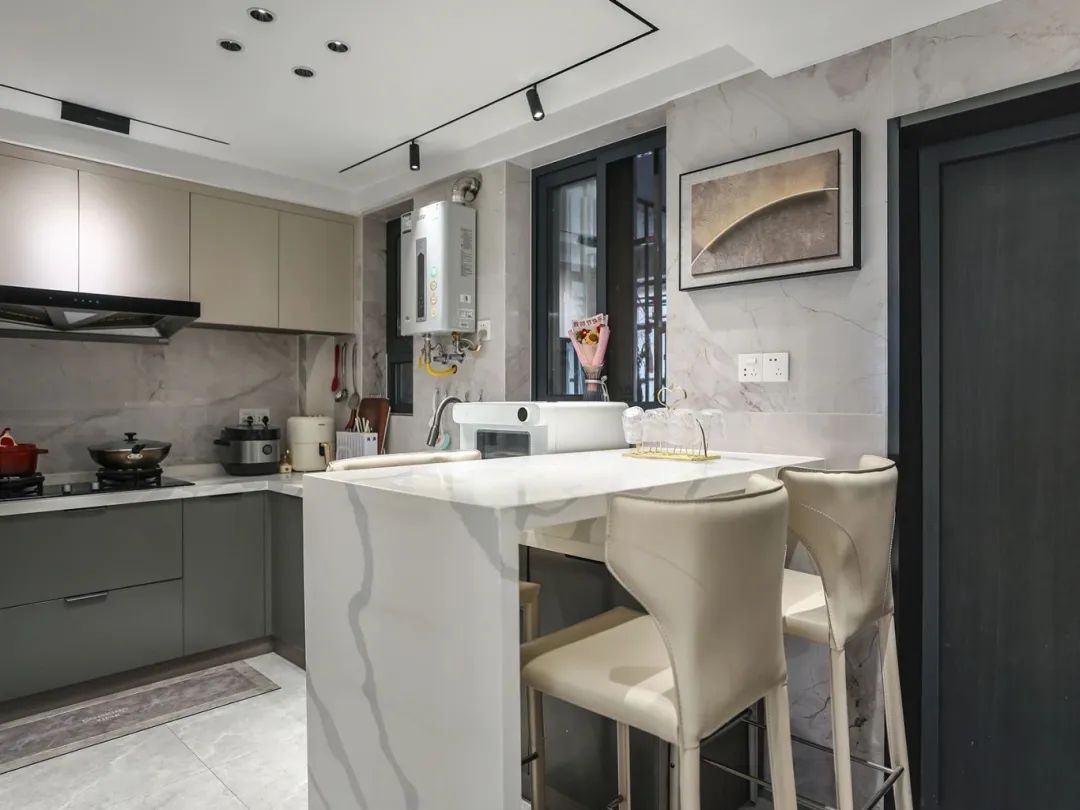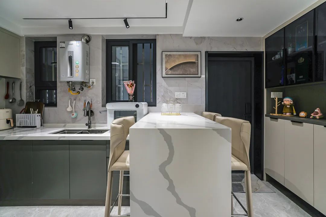 為了更好的利用空間,我們將廚房原本的封閉空間,改成為開放式廚房。并借空出區域設置了餐臺,夫妻二人配合烹飪上菜非常方便。如果將此區域用于早餐、下午茶、睡前甜點等快食空間,極具實用性和時尚感。