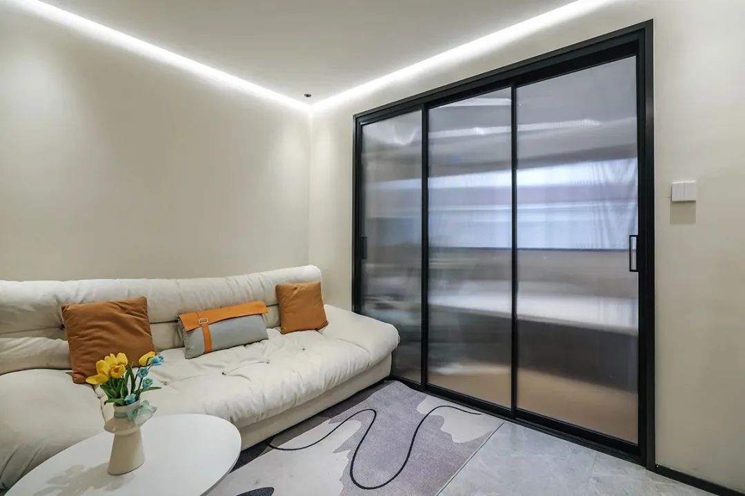 值得一提的是,我們為客廳特別設計了三聯動移門。這種設計不僅增加了空間的通透感,更能讓光線充分灑落,使客廳更加明亮。