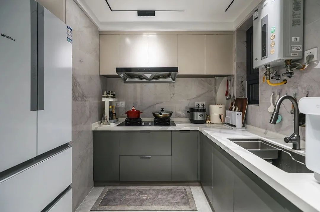 廚房采用U字型廚柜與島臺相結合,這種獨特的設計不僅符合廚房的操作流程,從取材、清洗、切配到炒煮、擺盤,都得以流暢進行,更使得廚房的空間得到了最大化的利用。