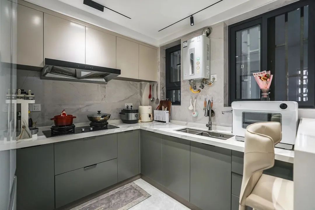 廚柜設計充分利用了轉角空間,使得各類廚具、餐具和食材都能夠有序擺放,方便取用。而島臺不僅為廚房增加了額外的操作臺面,還內置了儲物柜或抽屜,進一步增加了儲物空間。