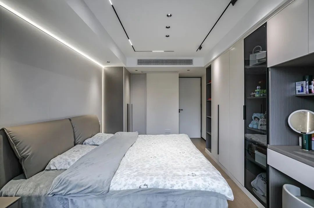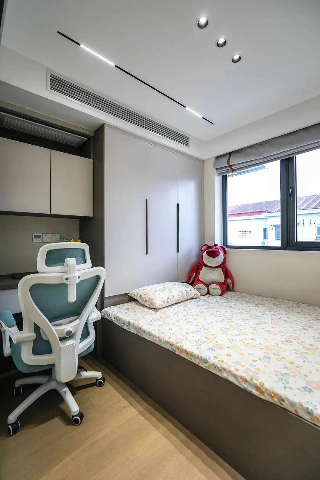 兒童房也進行了全屋定制,衣柜區域正對進門區做一排上柜,里面可以放小朋友的玩具和書本。床頭背景墻米白色結合淺灰色竹木纖維墻板,既讓奶灰色柜門和墻面、頂面渾然一體,同時呼應了灰色床、床頭柜。