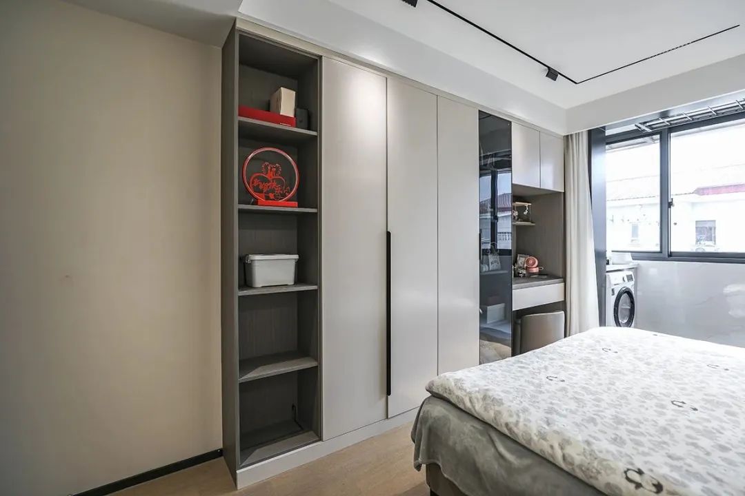 根據業主夫婦衣物較多的情況,我們特別為業主定制了通頂組合柜,不僅能提供充足的收納空間,還能分類擺放讓臥室空間更加有序。