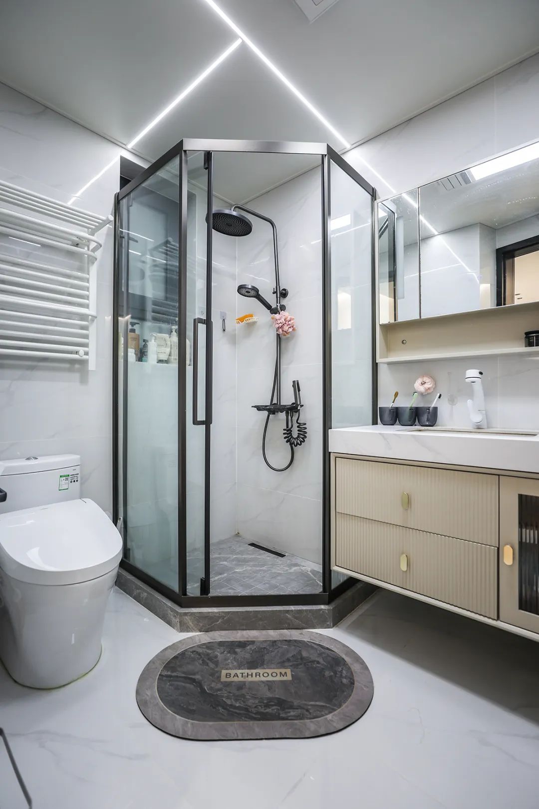 考慮到衛生間的空間布局和功能性需求,我們在淋浴房的兩側分別放置了馬桶和臺盆。這樣的布局不僅充分利用了空間,還確保了日常使用的便利性。特別是在早晨或晚上,這種布局可以減少動線的交叉,讓使用過程更加流暢。