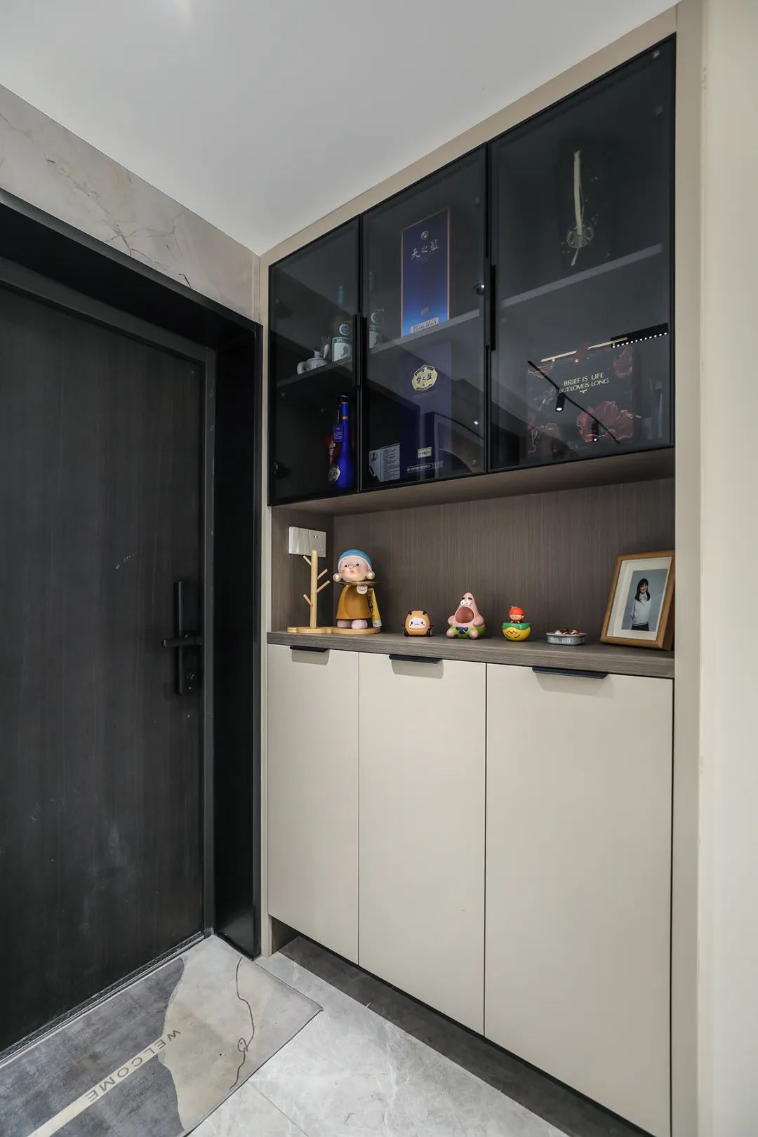 進門玄關處,定制了一個超大的收納鞋柜,柜體分上下兩個部分,下面柜體可容納大量鞋子及物品,上方玻璃柜體可放置收藏品,中間鏤空可放置挎包、鑰匙等,底部鏤空處與常規鞋等高方便換室內拖鞋,非常實用。