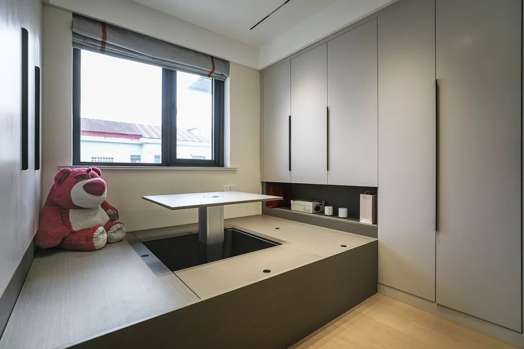 為了給業主提供一個既娛樂又休閑的空間,我們特別設計了一處多功能區域。這個區域的核心是一整排靠墻通頂的衣柜,為業主的衣物提供了一個寬敞且私密的儲物空間。在多功能區域中,我們還融入了榻榻米床的設計,在榻榻米中央區域,我們巧妙地設計了升降桌,它不僅可以作為娛樂的棋牌桌或游戲桌使用,還可以作為用餐的餐桌。這種設計不僅個性十足,而且充分展現了空間的靈活性和多變性。
