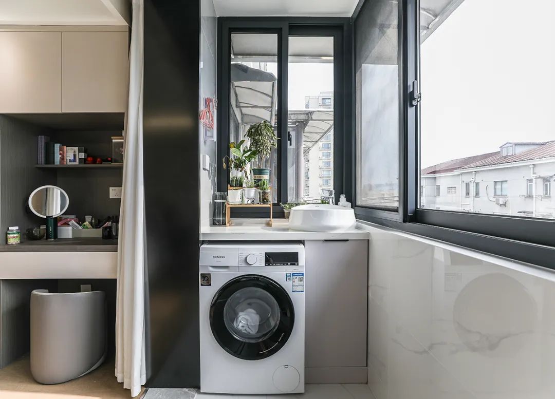 陽臺處我們采用了多功能設計,讓原本單調的空間有了收納、洗衣、晾曬、梳洗、觀景、閱讀等多種功能。右手邊原木色定制柜體做了當下很流行的洗衣柜組合,洗衣機旁邊做了小洗手池,可以方便清洗內衣等小件衣物。