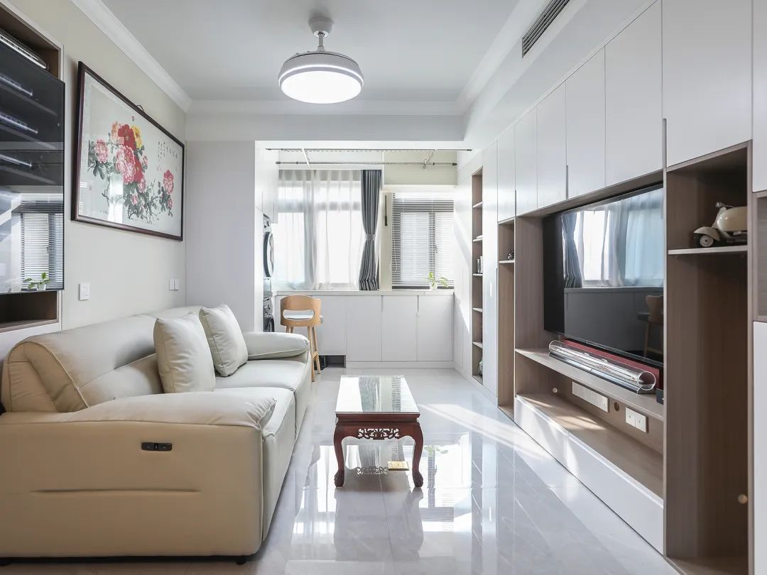 陽臺與客廳打通增大空間的同時也做了大量的儲物,洗衣機烘干機上下疊放,邊上做了一組家政柜放置吸塵器等家政用品,小小的空間有大大的利用。