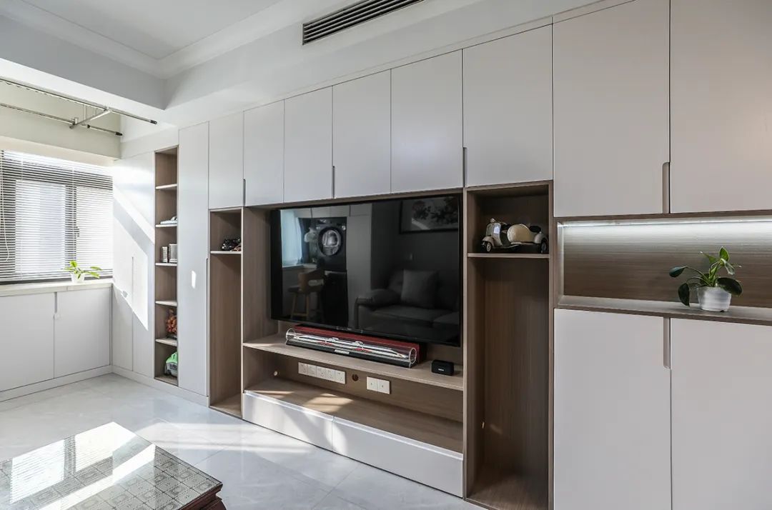 進戶鞋柜與電視柜整體做成一體式的柜體,設計采用下方和中間漏空,下方放鞋,中間放工藝品,讓鞋柜功能齊全,顏色和防盜門、進戶門套能夠協調。
