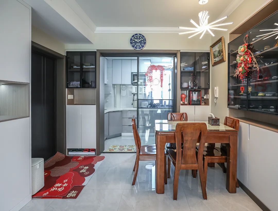 餐廳空間把非承重墻體打掉做成了餐邊展示柜,餐桌椅是業主原來的老家具保留的,整體氛圍簡單溫馨。