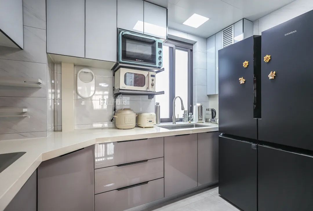 該套房子廚房空間很大,L型三面櫥柜,另外冰箱邊上也有操作臺,顏色簡潔明快,材質要干凈和好打理,白色的吊頂和米色的上櫥柜、深色的下櫥柜相呼應,石英石臺面干凈、好打理,各種廚房電器全部配齊,滿足主人制作各種美食的需求。