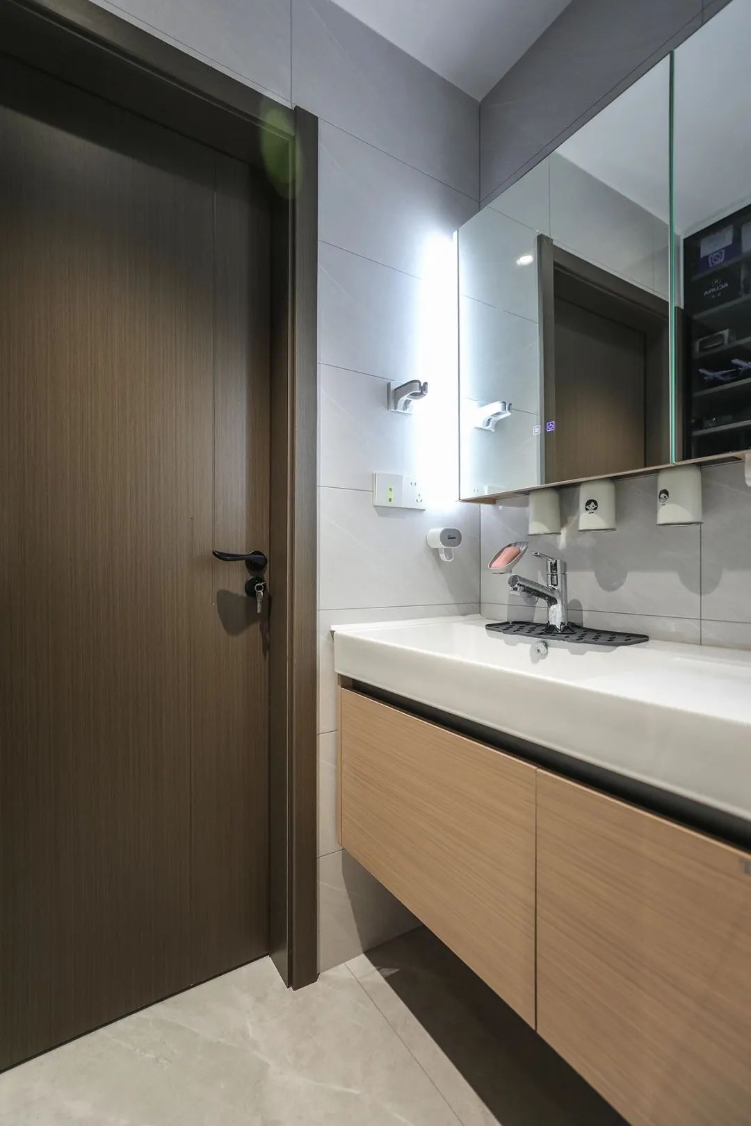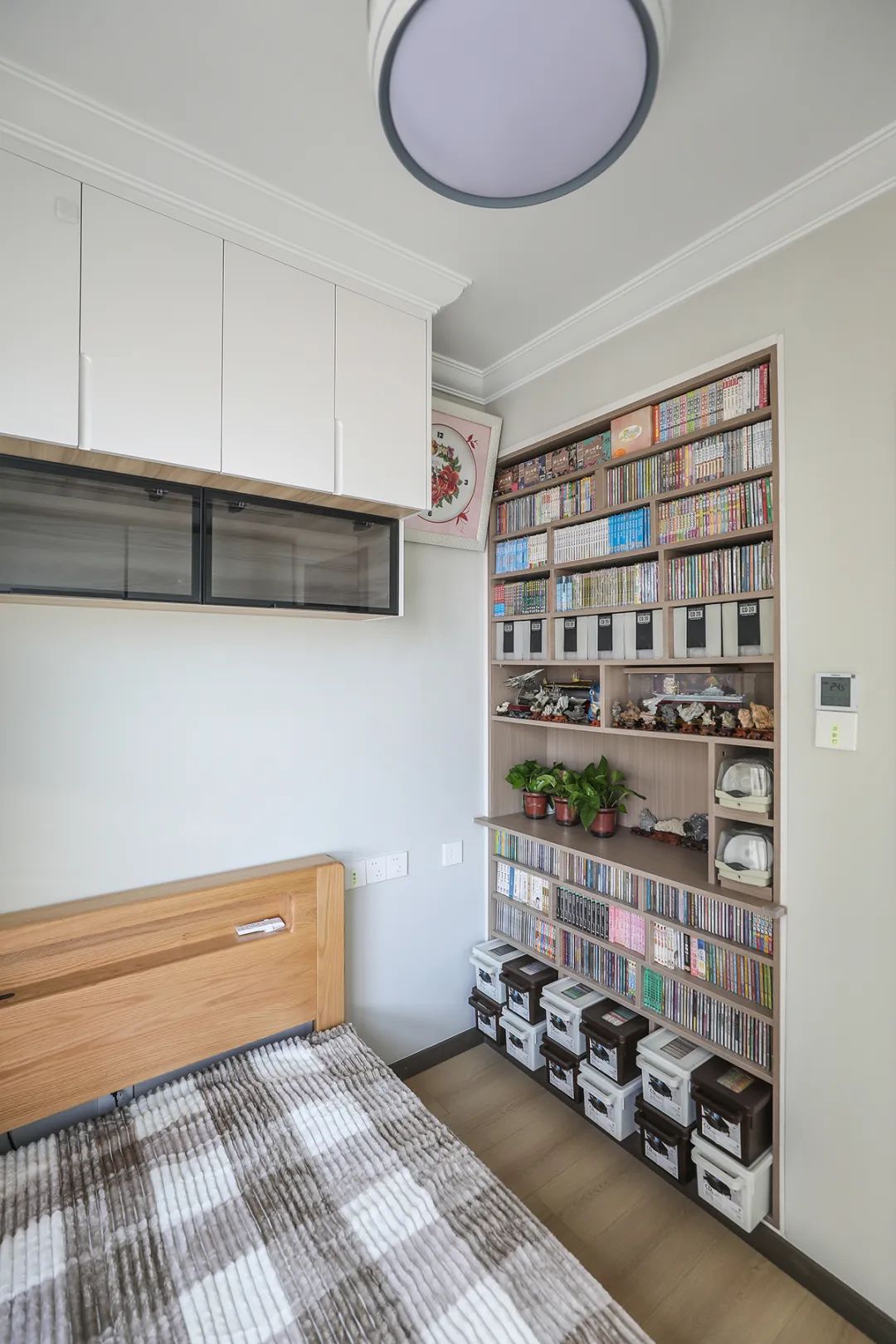 業主家里有上千件的收藏,有書籍和汽車模型,我們設計的時候考慮拆除所有的非承重墻體,然后用柜體做為隔斷,這樣盡可能的放大儲藏。衛生間這邊考慮做干濕分離,把干區臺盆與濕區獨立分開,從而讓衛生間利用率更高。把北面小房間做成了獨立的書房,兩邊柜體用于書籍的收納,整體風格簡約大氣,舒適宜居。