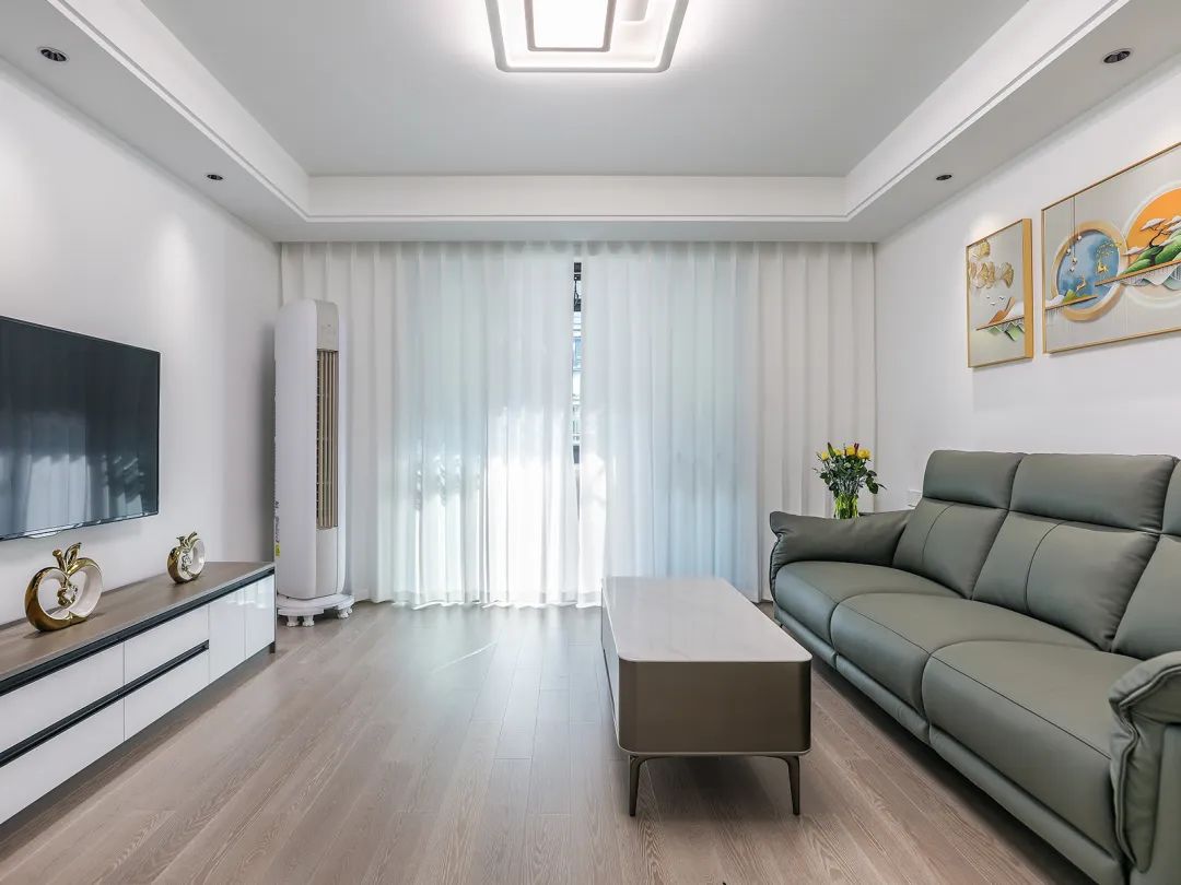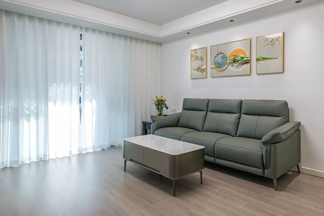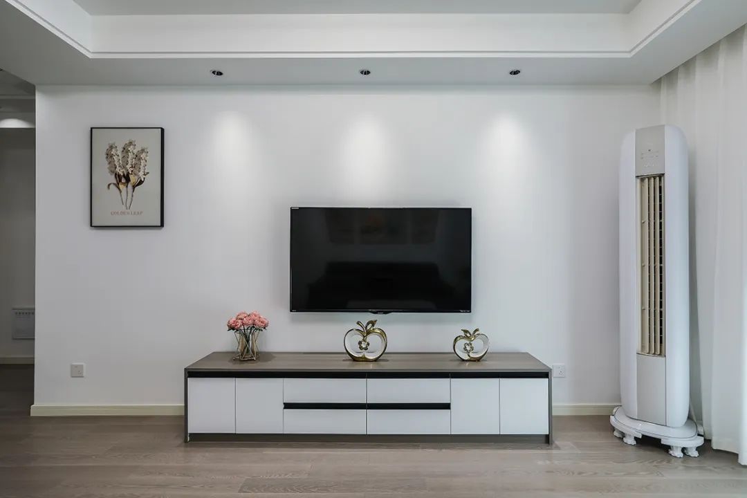 窗簾顏色和沙發(fā)相呼應(yīng),和白色陽臺門套相配襯,電視柜與茶幾的裝飾,讓空間活躍很多,通長電視柜也很大氣,沙發(fā)后搭配的壁畫,讓整個空間呈現(xiàn)一種欣欣向榮的感覺。