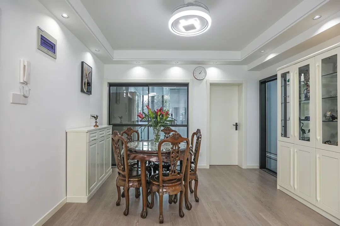 餐廳合理利用,餐桌邊做邊柜保證儲物空間,右手邊玻璃展示高柜放置兒子的手辦。保留的原始圓形的餐桌,平時家里只有2-3個人吃飯,夠主人用搭配上方風(fēng)扇燈,簡潔實用。