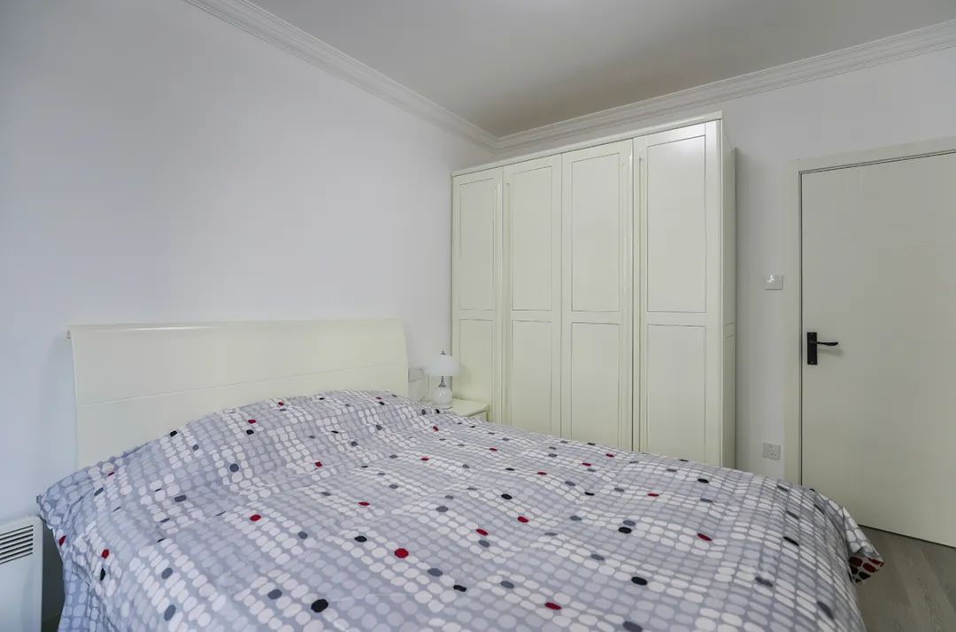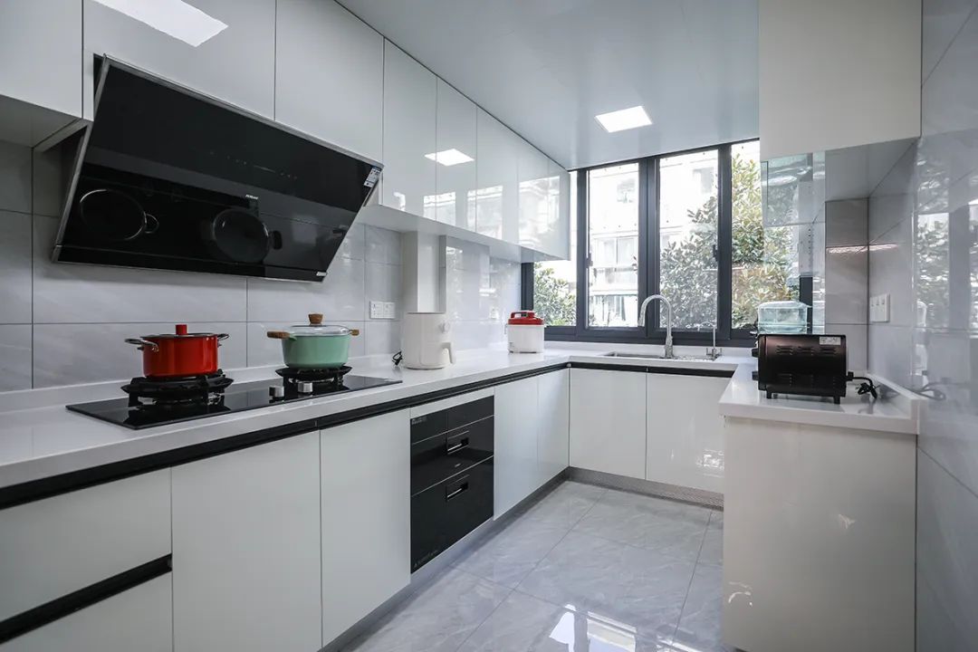 該套房子廚房空間較大,U型三面櫥柜,采用高光pet門板,顏色簡潔明快,材質(zhì)干凈和好打理,白色的吊頂和白色的上、下櫥柜相呼應(yīng),石英石臺面干凈、好打理,各種廚房電器全部配齊,滿足主人制作各種美食的需求。