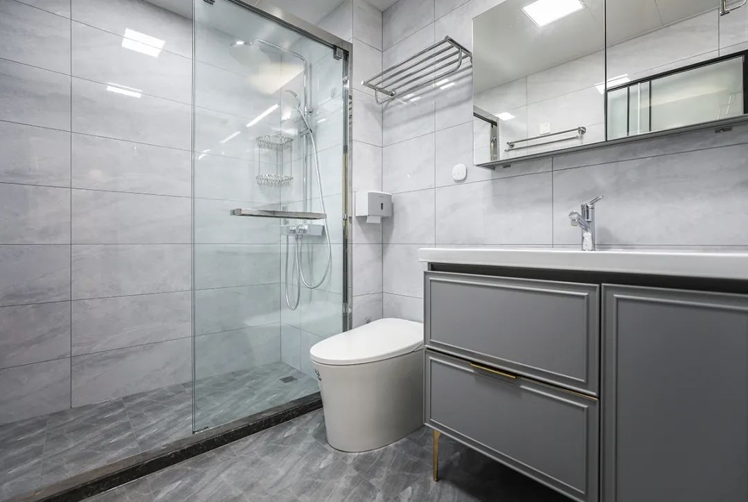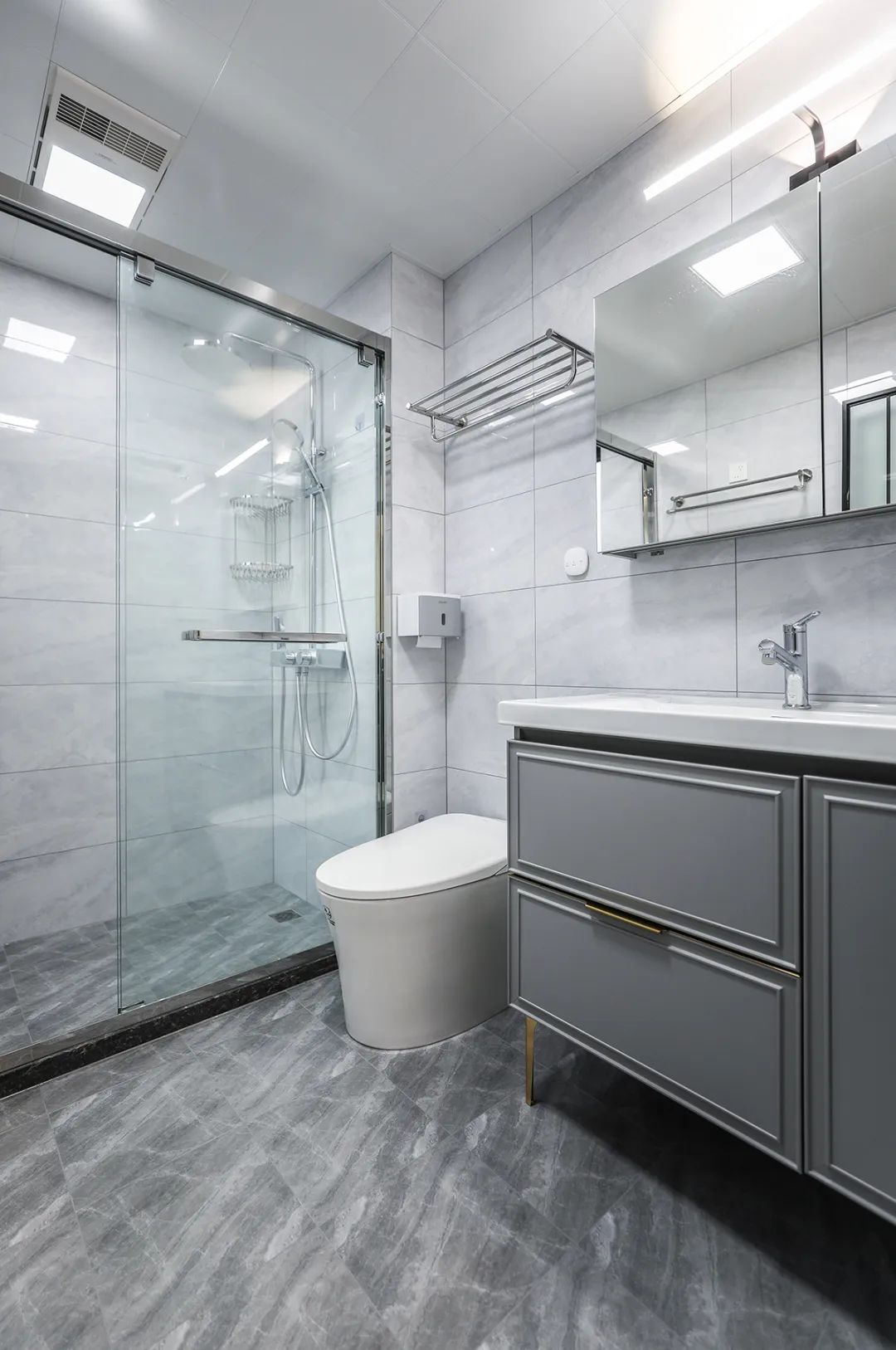 主衛(wèi)生間不大,不銹鋼本色淋浴房邊框、白色馬桶,墻地一體柔光磚、白色吊頂,長虹玻璃鈦合金開門,體現(xiàn)主人高檔次的生活品味和優(yōu)雅的審美觀。