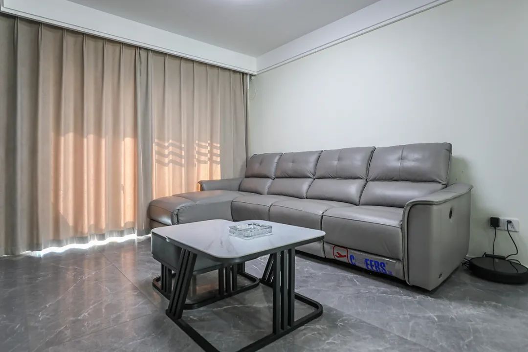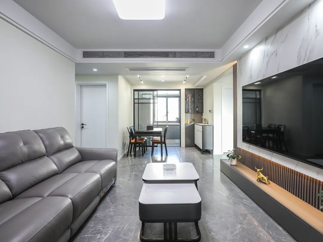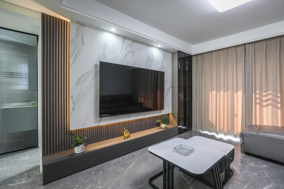 淺灰色沙發、創意巖板高低茶幾相互配合,明暗有神,沙發區域的檔次提高很多。