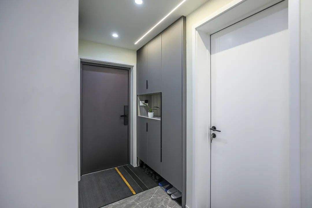 入戶玄關定制鞋柜,鞋柜分為上中下側邊四個部分,下方放鞋,中間放工藝品,上方儲物,而側邊可以隨手放置四季穿的外套,尤其方便暫存長款的大衣。