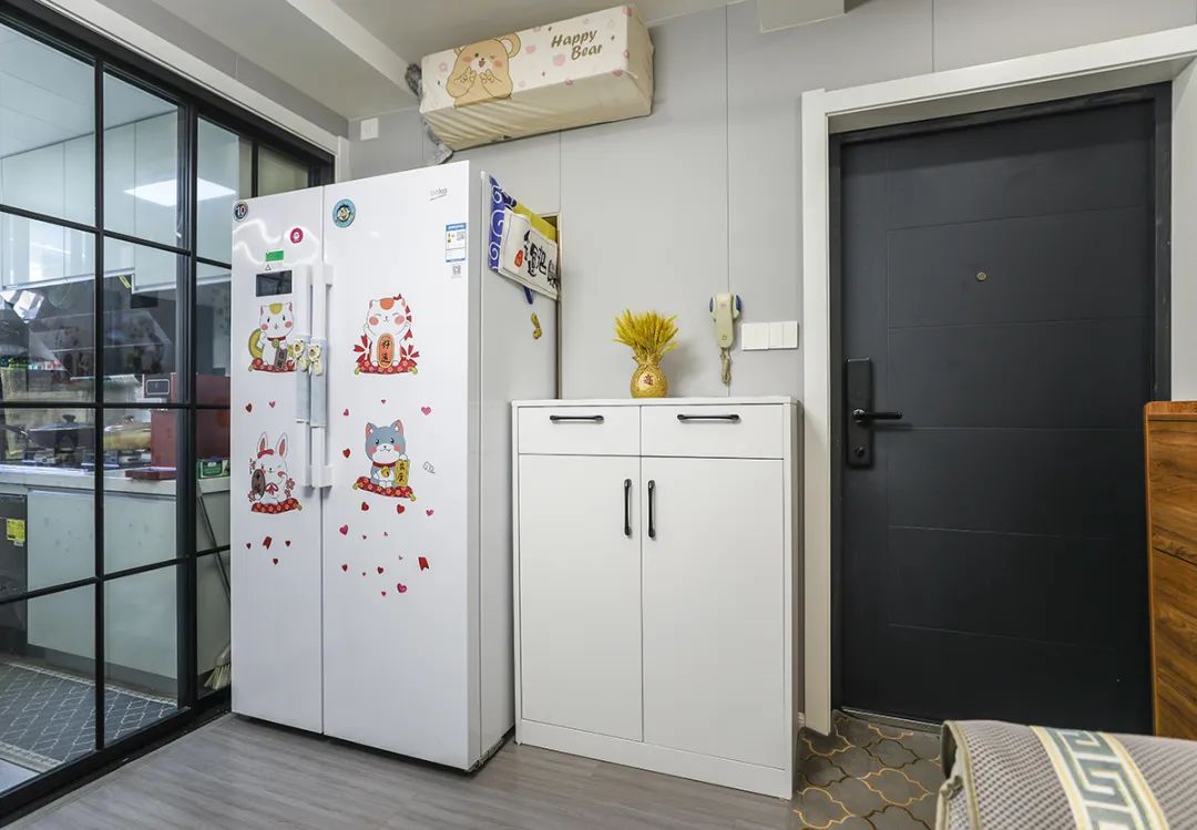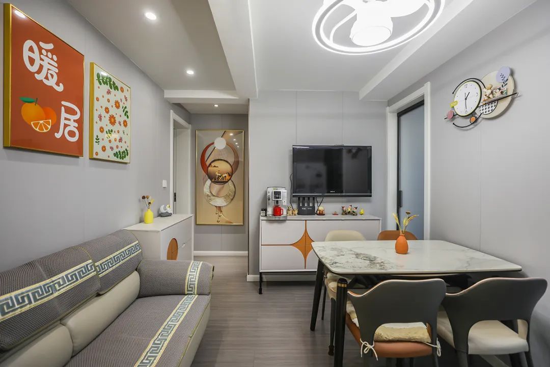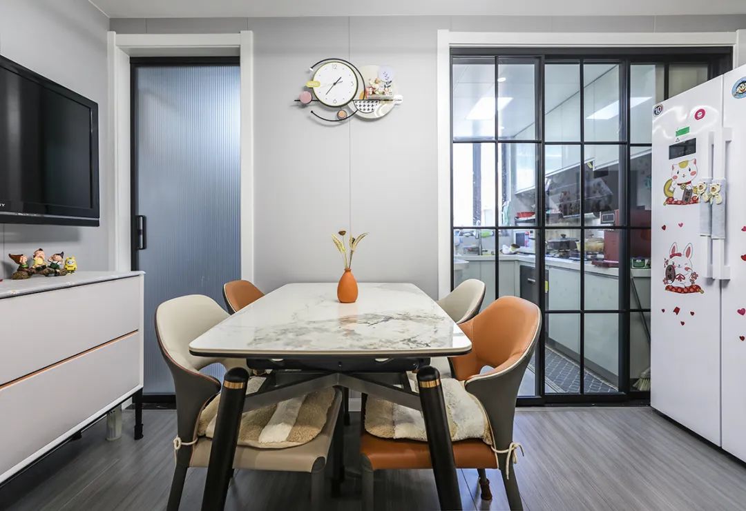 本次裝修以簡約風格為主,墻面采用集成墻面替代乳膠漆。頂面采用整體石膏板吊頂,解決墻頂面開裂的問題。廚房采用雙玻璃移門,增加客廳的通透感。
