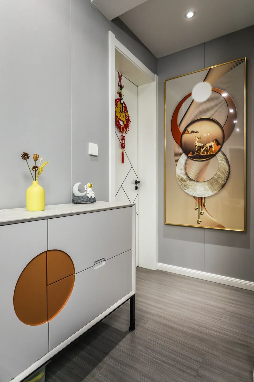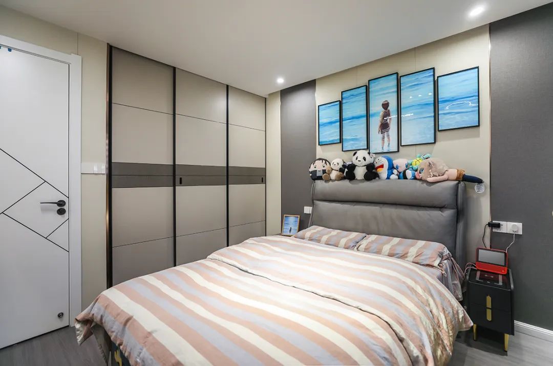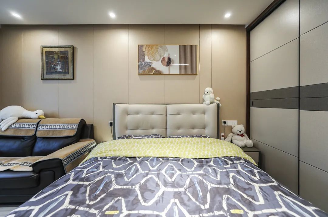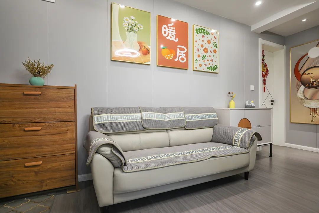 空間整體以米灰色調為主,將現代感軟裝與整體空間色調融為一體,三聯動移門更為客廳增加了光感。