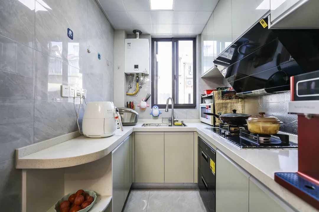 廚房U字型廚柜設計,使得取、洗、切、炒、擺的操作流程更順暢。上下柜設計使小小的廚房的收納能力也大大提升。