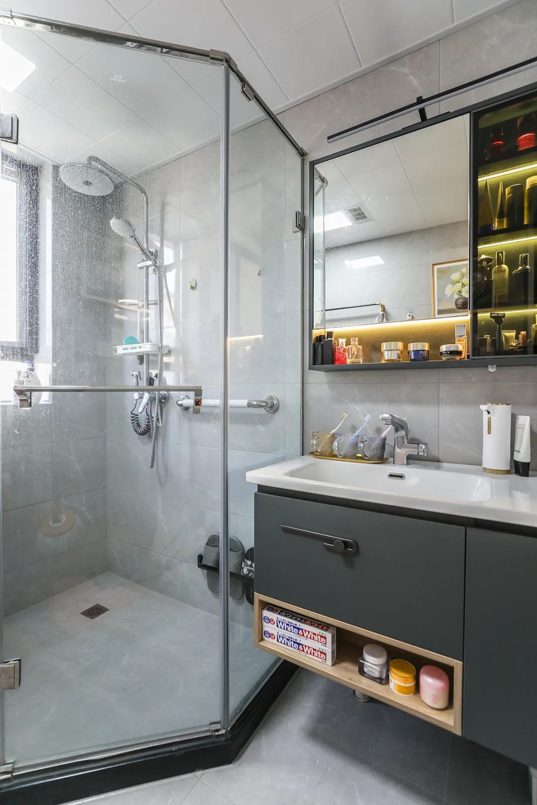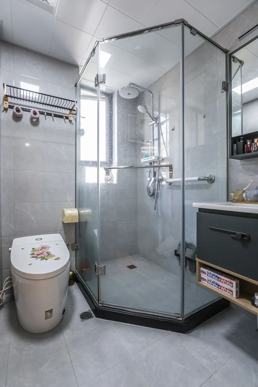 衛生間容易積聚潮氣,所以通風特別關鍵。鉆石形淋浴房靠窗擺放,兩側分別放置馬桶、臺盆。小衛生間把晨起主要活動空間集中在一起,而且動線符合人的行為習慣,讓此功能區更加實用。