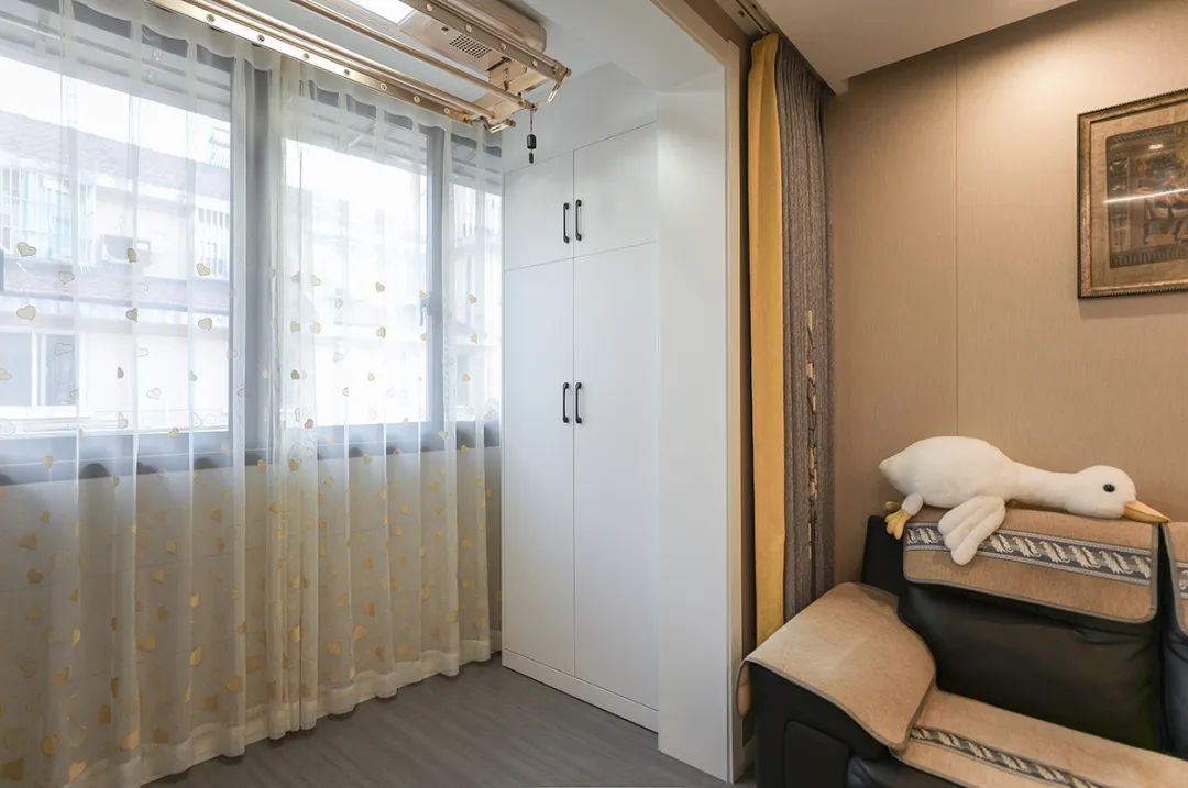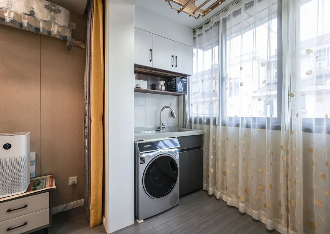 由于衛生間面積有限,我們將洗衣機移至陽臺。我們還在上方定制一個柜子,增加儲物空間。下方我們做了一個小型洗衣池,洗衣機可嵌入洗手池底部。不僅提升了空間的使用效率,同時也使生活更加便捷和有序。